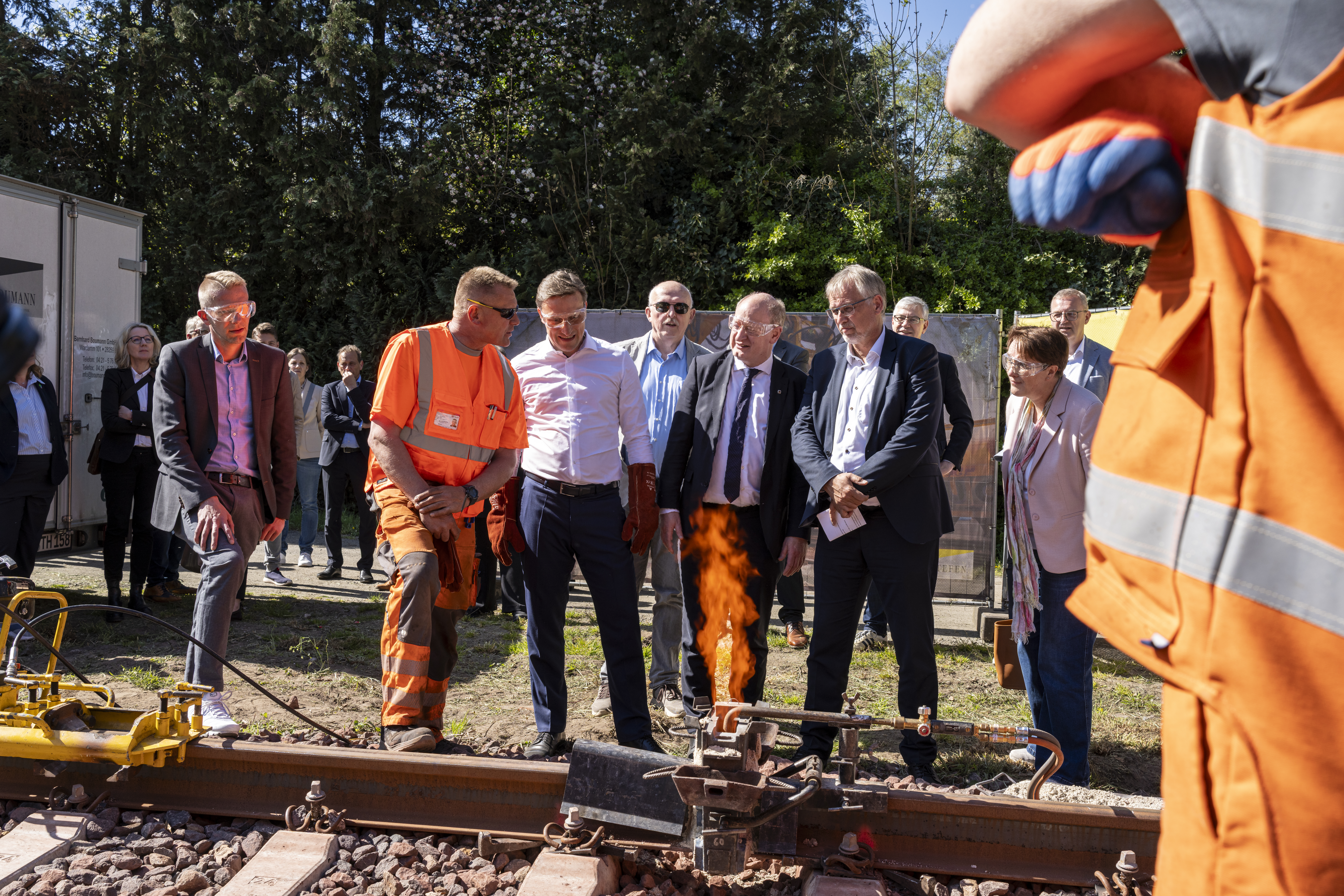 Nach einem entspannten Empfang am Bahnhof in Nordhorn starteten die rund 40 geladenen Gäste aus Politik und Wirtschaft mit einem Sonderzug in Richtung des zukünftigen Haltepunkts in Veldhausen. Dort stand ein besonderer Programmpunkt auf dem Fahrplan: Unter fachkundiger Anleitung der ausführenden Baufirma nahm Sebastian Lechner persönlich eine Schienenschweißung vor und konnte sich dabei ein anschauliches Bild von den Arbeiten machen.